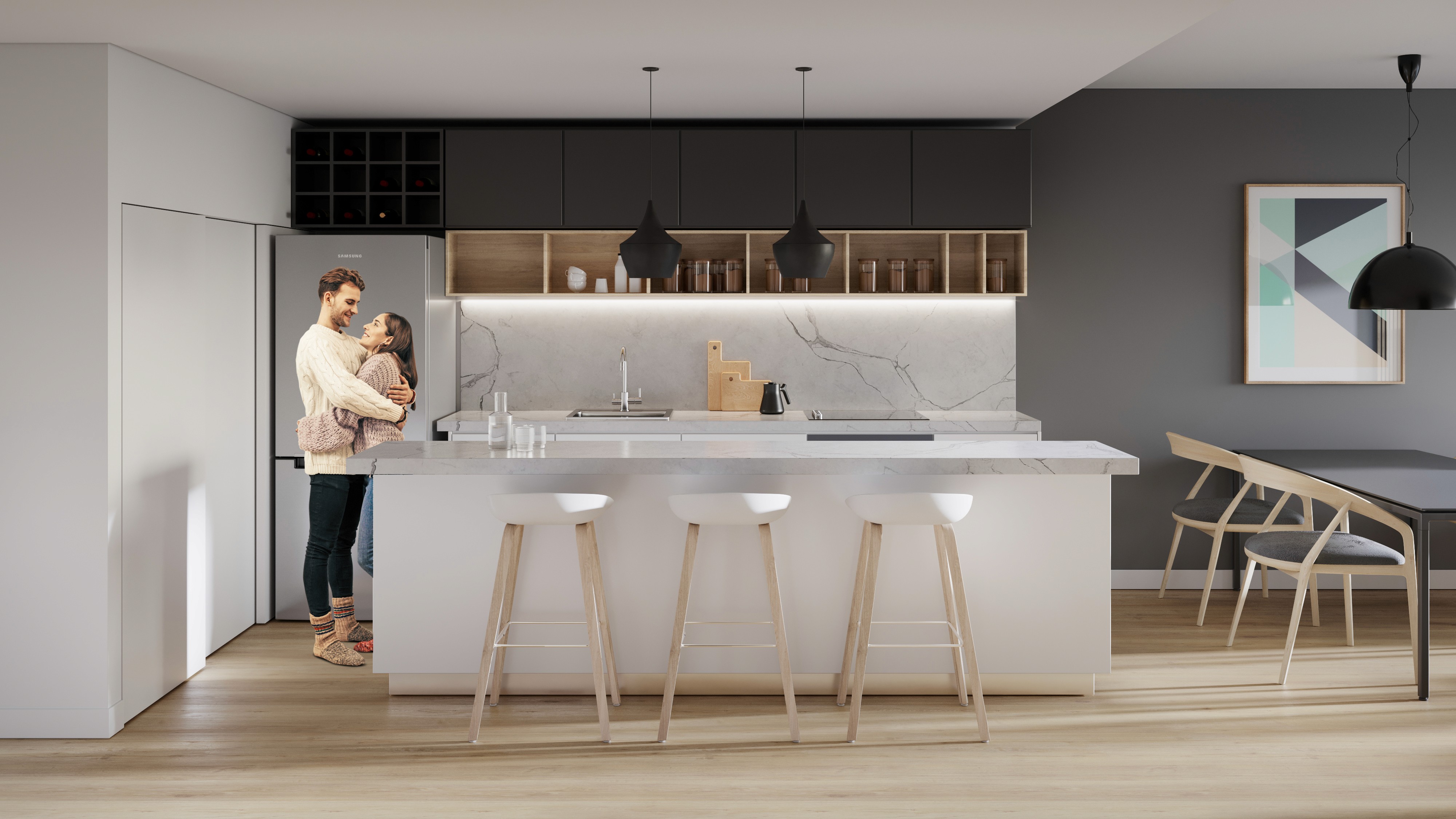 3 ambientes, cocina con barra, comedor, living con toilette